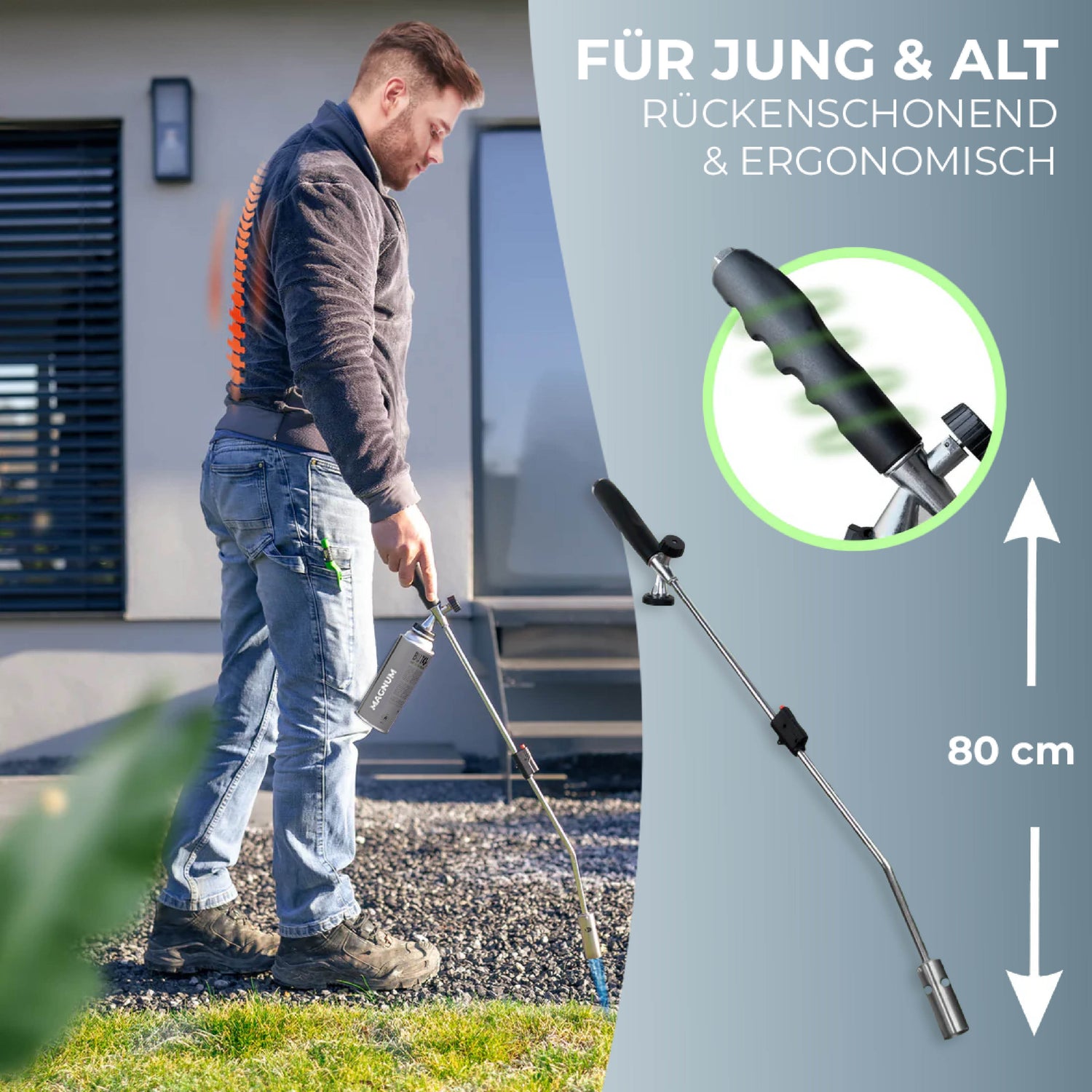 Erlebe komfortables Arbeiten mit dem MAGNUM® Unkrautbrenner! Die ergonomische Länge von 80 cm ermöglicht rückenschonende, sichere und chemiefreie Unkrautentfernung – ideal für eine entspannte Gartenpflege in jedem Alter.